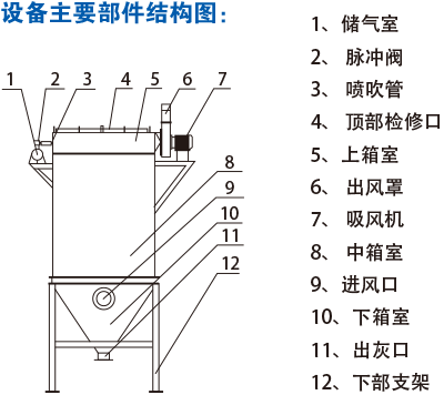 | 設(shè)備型號 | 處理風量 (m3/h) | 過濾面積 (m2) | 濾袋 數(shù)量 | 過濾風速 (m/min) | 阻力 (Pa) | 進口 濃度 (g/m3) | 出口 濃度 (g/m3) | 清灰壓縮 空氣壓力 (MPa) | 脈沖閥 數(shù)量 |